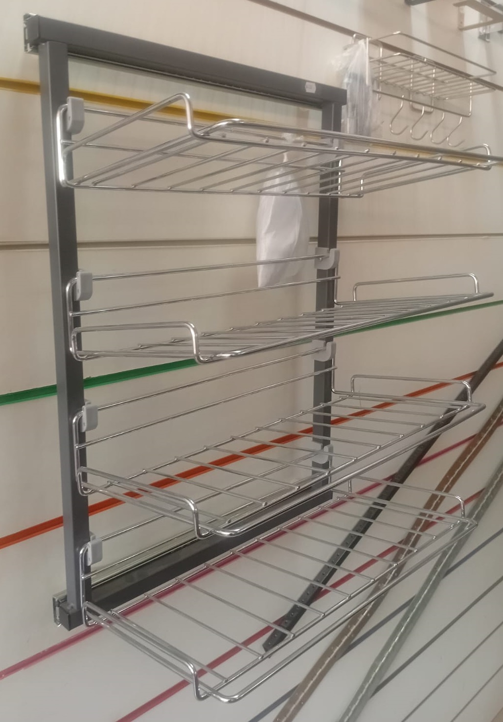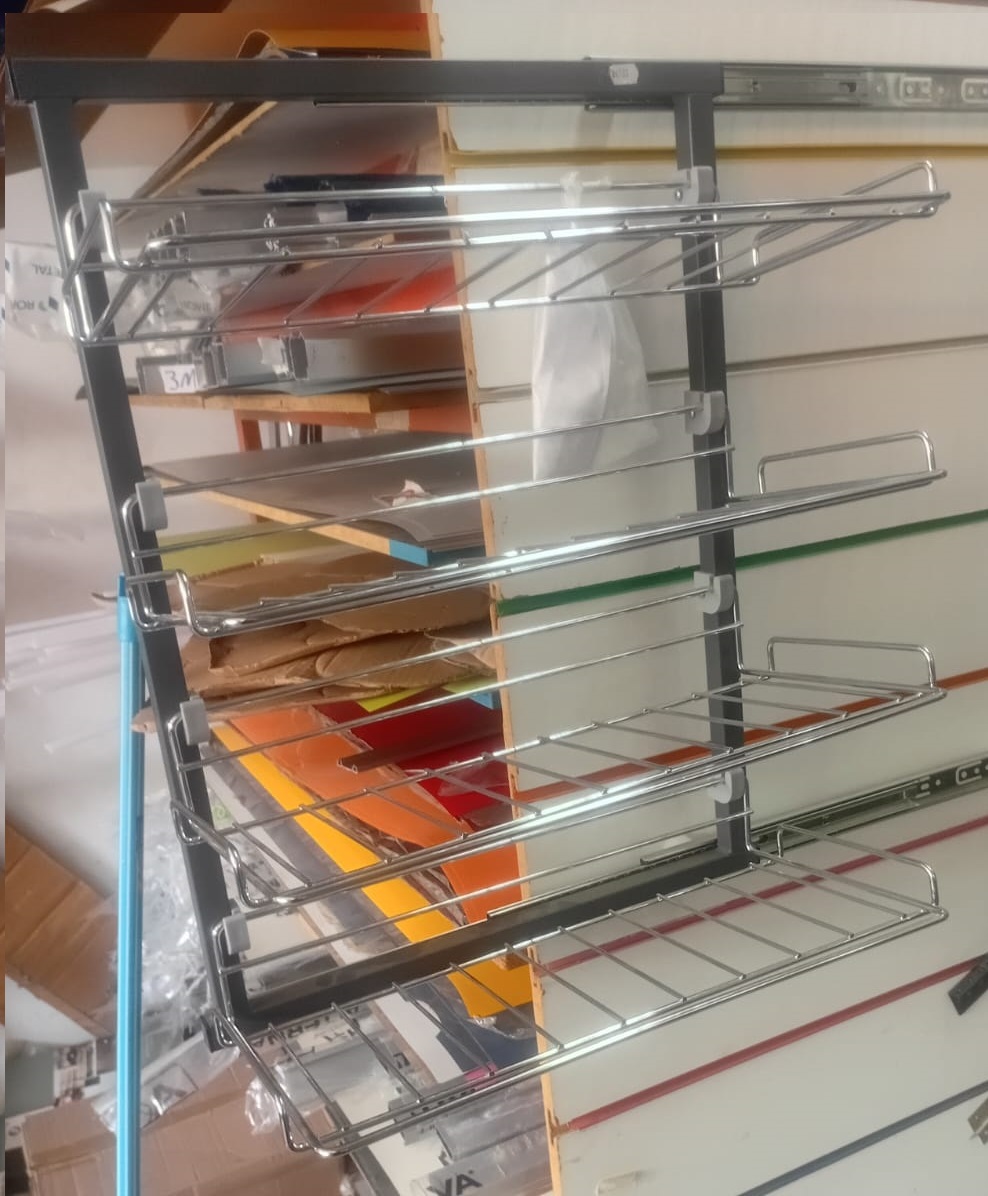 Cestos aramados fabricados em aço carbono com acabamento cromado. Corrediças telescópicas de 450mm galvanizadas.